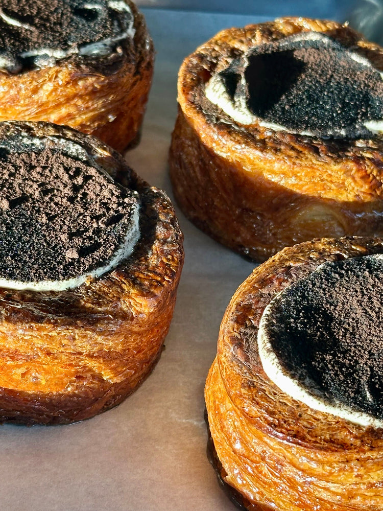 Our scratch-made buttery, flaky croissant dough filled with a mascarpone mousse and Bare-Knuckle Espresso-laced whipped cream, all topped with a dusting of dark cocoa powder